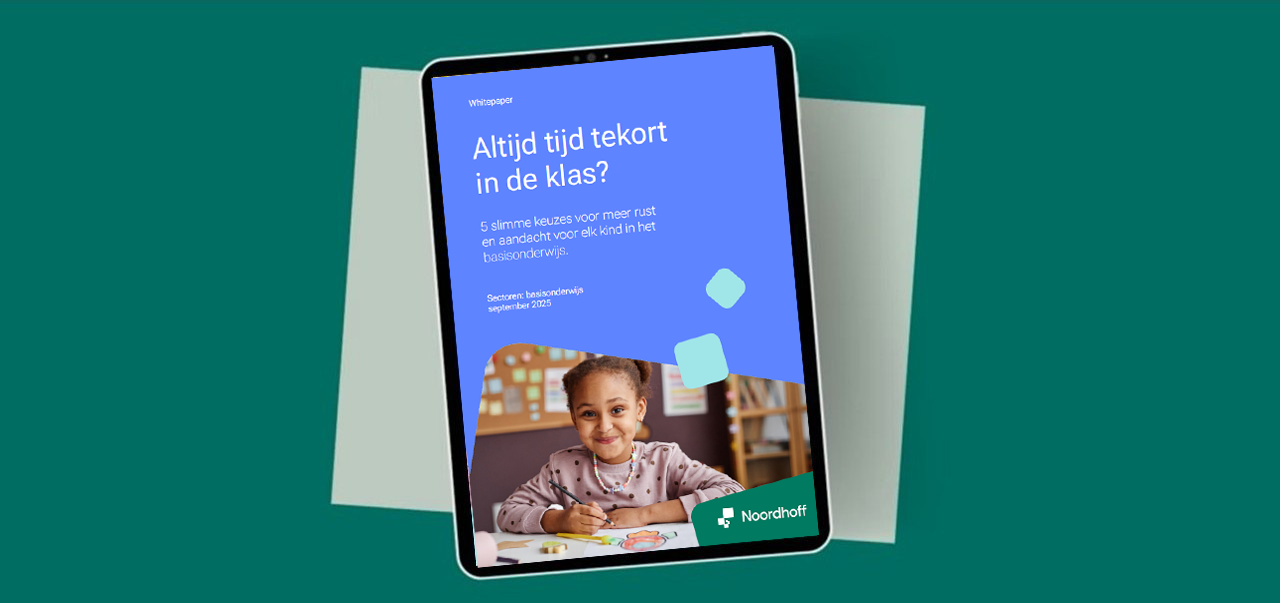 In deze whitepaper delen Niels Bak en Bas van Rijzewijk, methodespecialisten bij Noordhoff, vijf praktische keuzes die je vandaag al kunt maken. Gebaseerd op ervaringen uit de klas en bewezen didactische principes. Geen theorie, maar direct toepasbare tips die je helpen om meer rust, overzicht en aandacht te creëren in jouw klas.