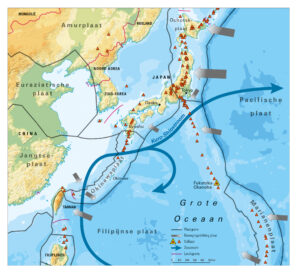 Voor de oostkust van Japan loopt de Kuro-Shio-zeestroom. Deze zeestroom zorgt het ervoor dat het water in noordoostelijke richting gaat. Voordat de Kuro-Shio-zeestroom het eiland Kyushu bereikt, vindt er een afsplitsing plaats. Dat zie je op de kaart. Een deel van het water buigt af met de wijzers van de klok mee en gaat in de richting van de Ryukyu-eilanden waarvan Okinawa het hoofdeiland is.